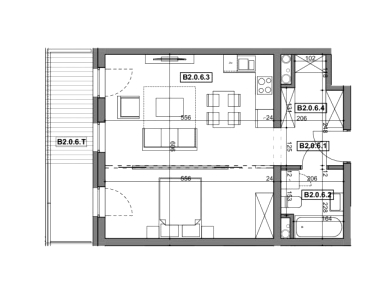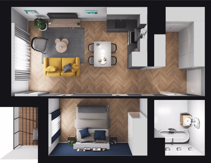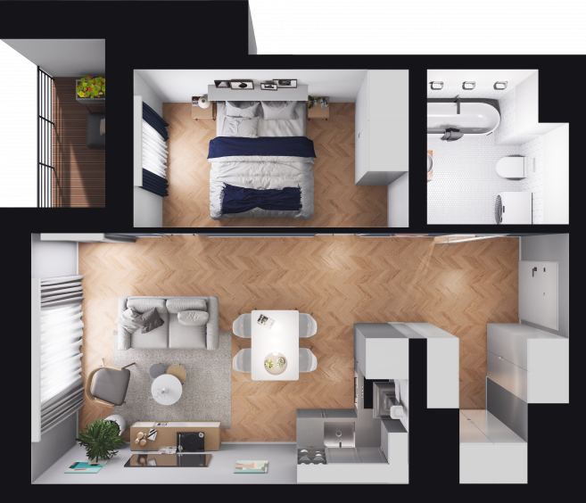 2-pokojowe mieszkanie składające się z salonu z aneksem kuchennym, pokoju, łazienki i tarasu, mieszczące się w nowej inwestycji Emilii Plater 7 w Szczecinie.